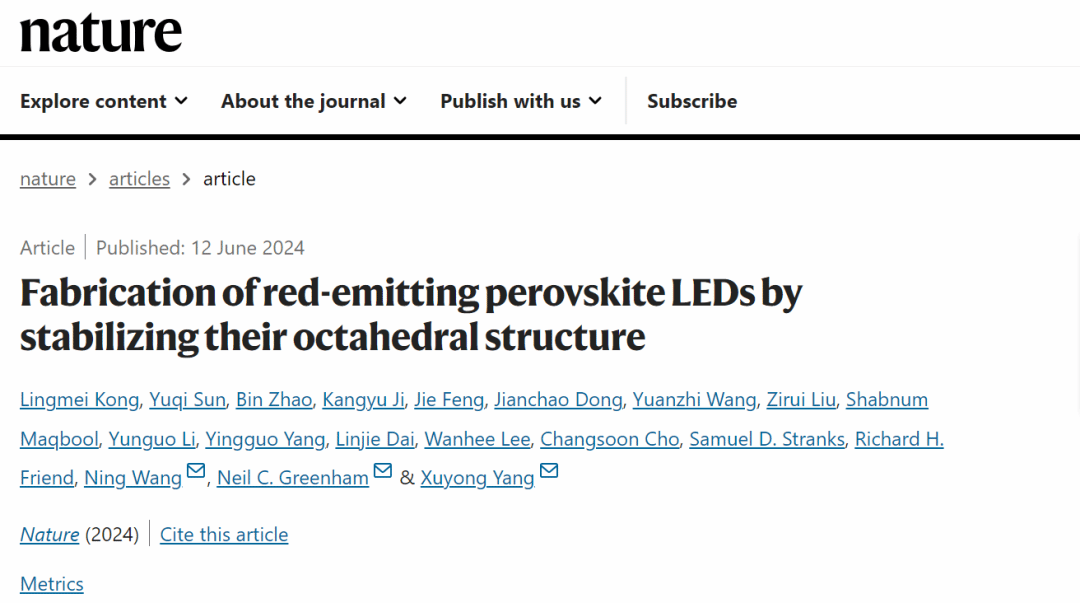 2024年6月12日,国产亚洲精品美女久久久机电工程与自动化学院新显教育部重点实验室杨绪勇教授研究团队与合作单位团队关于“稳定钙钛矿八面体实现高效红光LED”最新研究成果,以Fabrication of red-emitting perovskite LEDs by stabilizing their octahedral structure为题在国际顶尖期刊Nature上发表。论文链接:https://www.nature.com/articles/s41586-024-07531-9